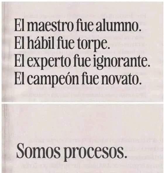 No nacimos aprendidos ni con experiencia. Los procesos que vivimos nos hacen maestros, hábiles, expertos y campeones. Es importante comprender que estamos permanentemente en un proceso de desarrollo, a diferente ritmo, al ritmo de cada uno. Y ese ritmo, es el proceso que cada uno de nosotros requiere para lograr metas y objetivos.